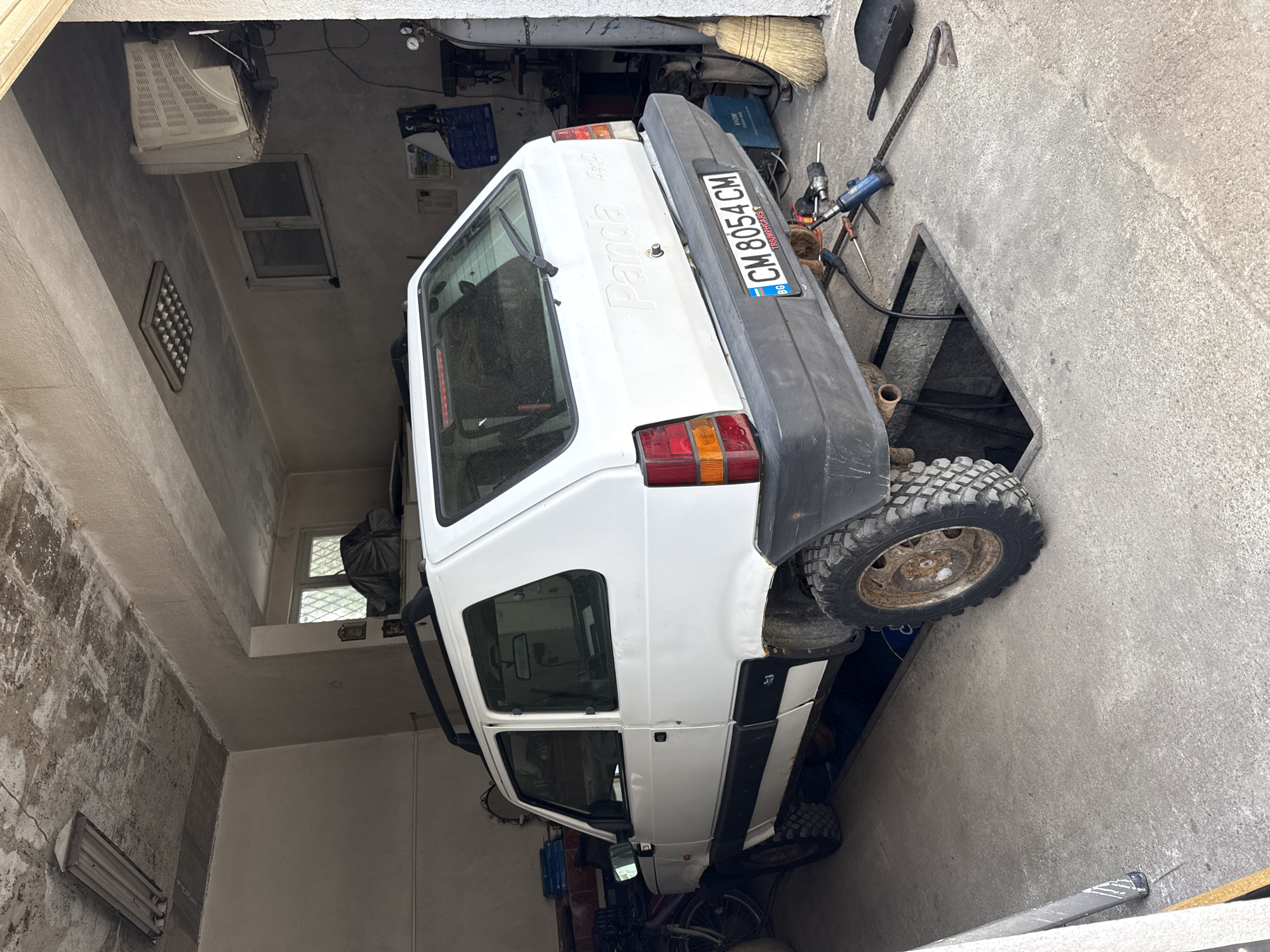 A white Fiat Panda 4x4 is partially situated over an open service pit in a garage. The rear of the car, bearing the license plate "CM 8054 CM," is positioned near the pit. A broom and a crowbar are also visible near the service pit on the floor. Various tools, including a blue impact wrench and other maintenance equipment, are positioned around the car. The license plate indicates that the car is registered in the Blagoevgrad Province of Bulgaria, and based on the context, it can be assumed that the location is in Gotse Delchev. The garage environment appears cluttered with various items, suggesting it is a working space for automotive maintenance.