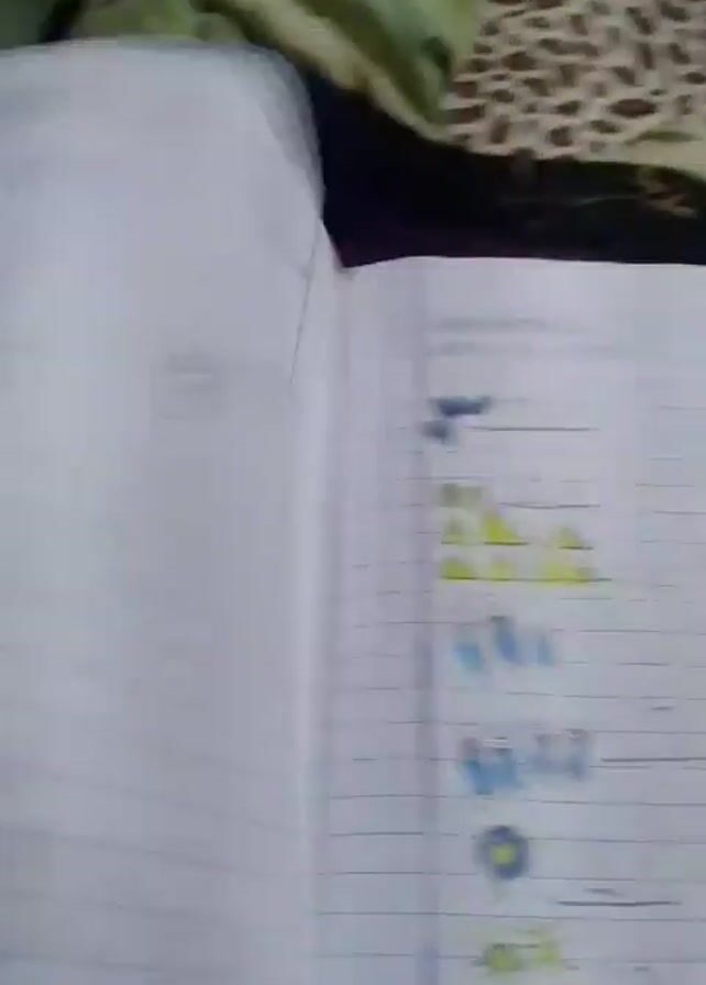 A hand opens a notebook to reveal different pages. One page has a series of numbers from one to eighteen written in Spanish. Another page has drawings of different objects and numbers with checkmarks next to them. A final page has drawings of a strawberry, sun, eye, star, purple cone, an orange semi-circle, and a cartoon figure. The notebook is on a patterned surface.