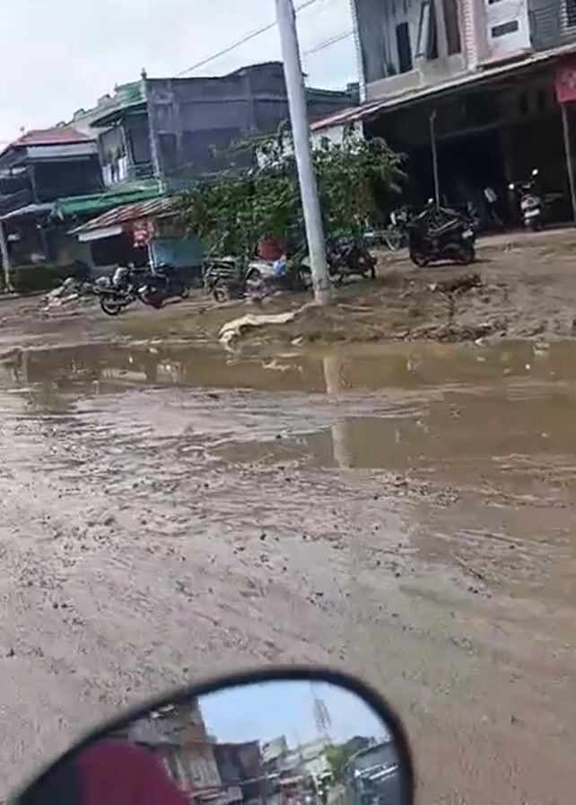 The video depicts a muddy street scene, likely after a period of rain or flooding