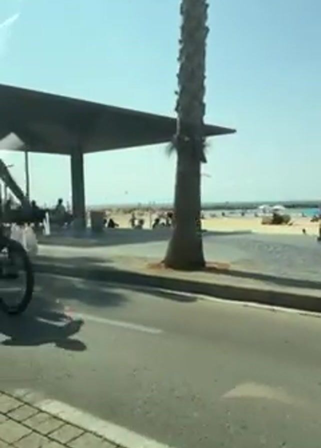 The video depicts a view from a vehicle moving alongside a beach promenade on a bright, sunny day. A palm tree stands tall near a modern, square-roofed structure with benches underneath, where people are sitting and walking. The beach, visible in the background, has people scattered across it. A cyclist passes by on the street, riding in the same direction as the vehicle. The road is paved and bordered by a tiled pathway.