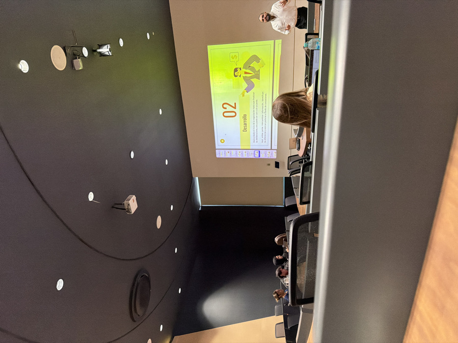A modern tiered lecture hall or conference room is depicted in Fraccionamiento Los Heroes Queretaro, Mexico. The room features a dark gray, curved ceiling with numerous recessed circular lights and a ceiling-mounted white projector. Walls are a combination of light beige and dark gray. A large white screen on the front wall displays a presentation slide with a bright yellow-green background, showing the number "02," the Spanish word "Desarrollo" (Development), and an illustration of a man speaking with a dollar sign. A male presenter with a beard, wearing a light-colored collared shirt and dark pants, stands to the right of the screen, facing the audience with his hands slightly open. In the foreground, the back of a person's head with light brown hair is visible, seated at a dark gray desk. Further back and to the left, approximately five individuals are seated in black mesh-backed chairs at dark gray desks, facing the presenter. A clear plastic water bottle is visible on a desk in the foreground.