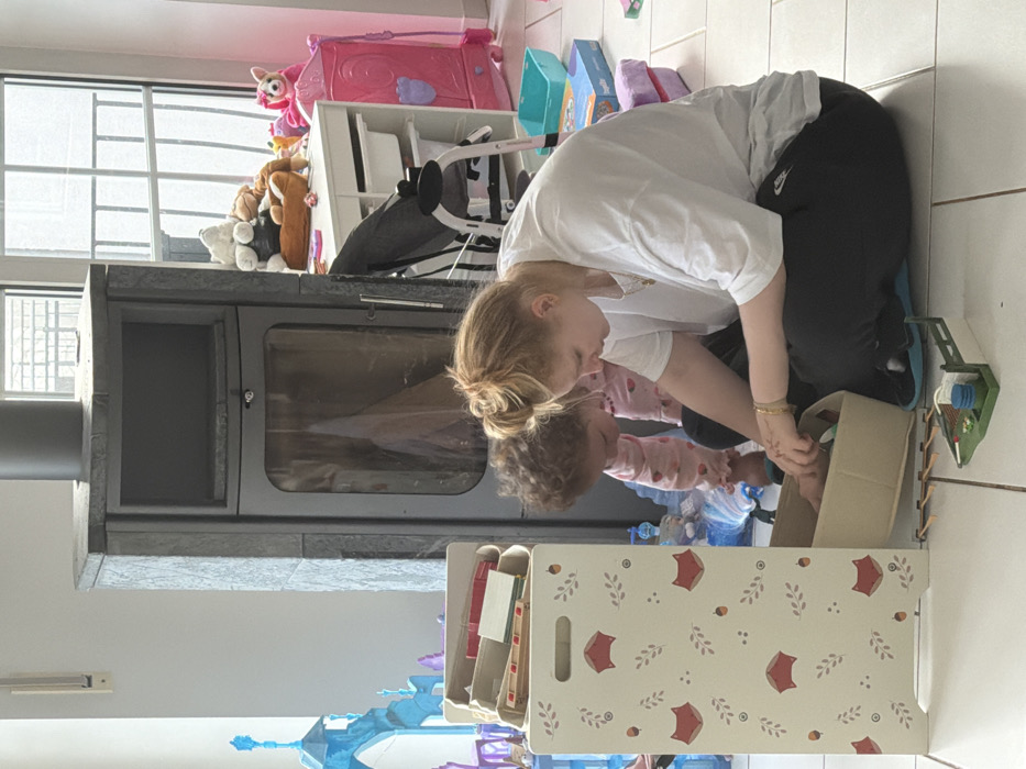 - "The image captures an indoor scene in Trassem, Germany, featuring an adult female and a young child engaged with toys on a white tiled floor" by FM-3ujak2, licensed under CC BY 4.0
