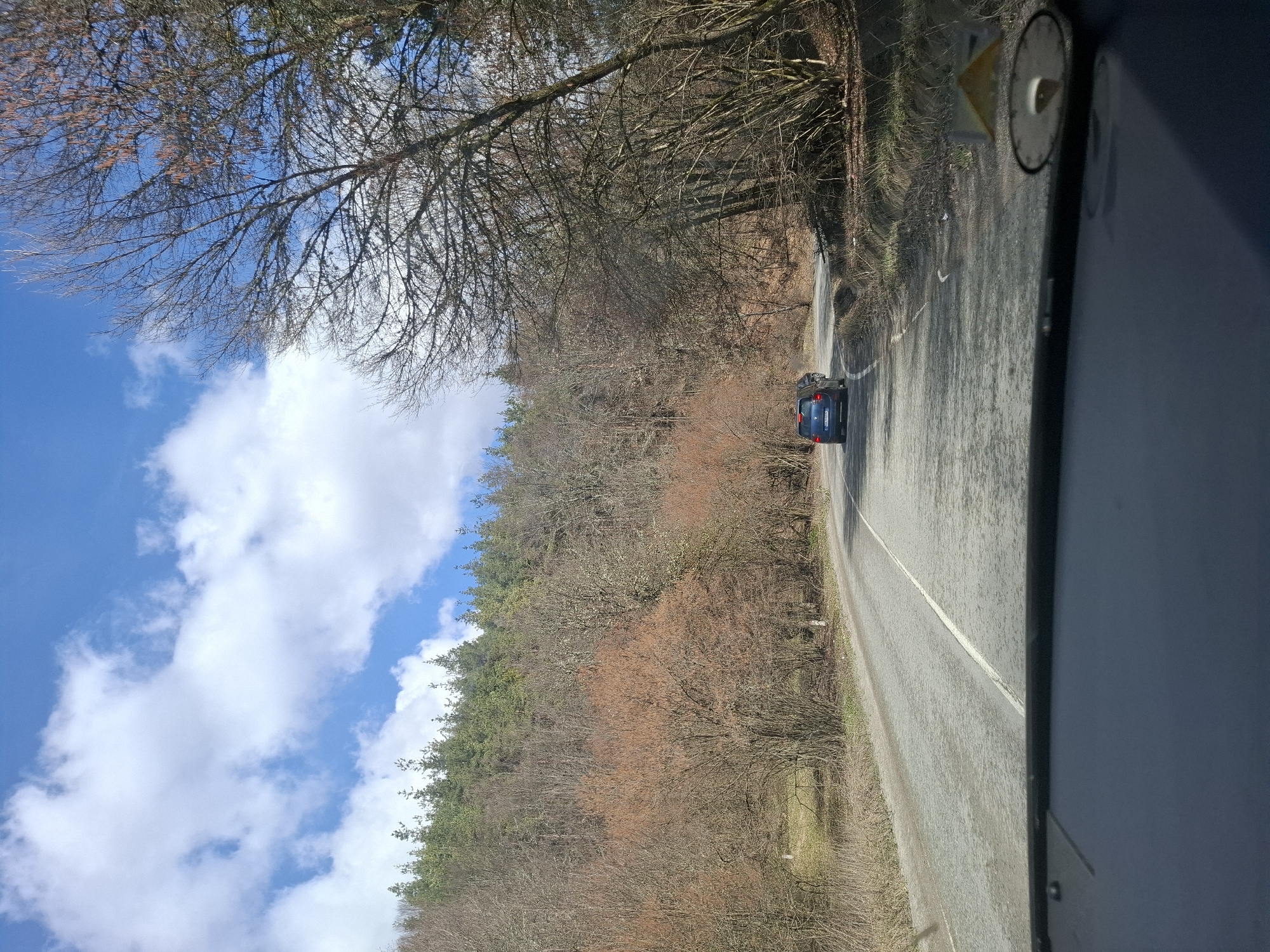 The image depicts a road in Manastirishte, Bulgaria. The road curves slightly to the left and has a solid white center line. A blue car is traveling on the road, ahead of the viewer's location. The surrounding environment consists of trees, with some bare branches and others with green foliage. The sky is blue with scattered white clouds. The photo was likely taken from inside a vehicle, as part of the vehicle's interior is visible on the right side of the frame.
