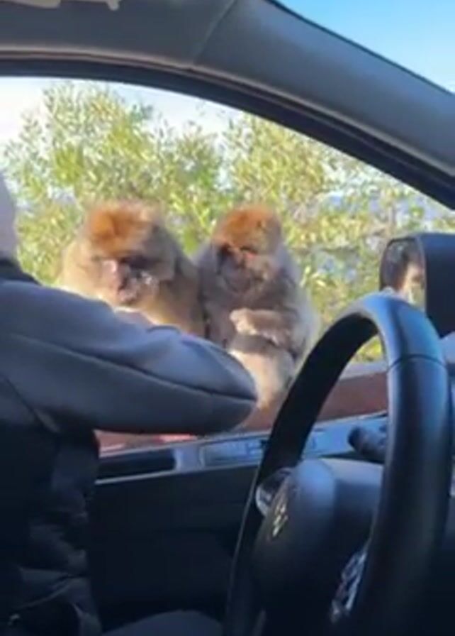 Inside a car, a person feeds two Barbary macaques sitting on the car's window ledge