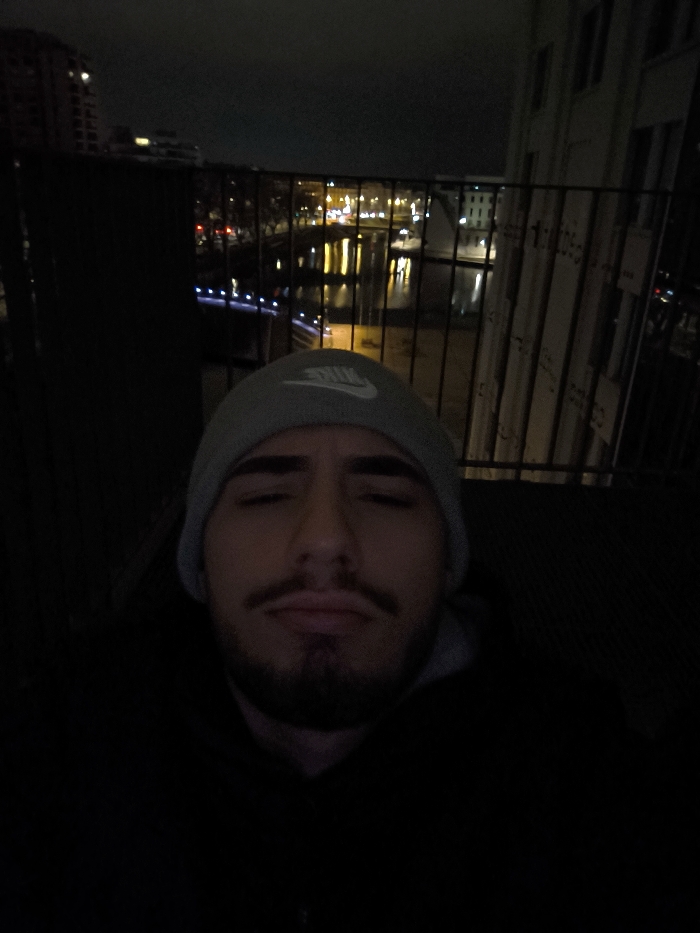 A dimly lit selfie shows a person with closed eyes, wearing a gray Nike beanie. Facial hair includes a mustache and goatee. Behind them, a dark, slightly out-of-focus view suggests a balcony overlooking a body of water. Lights are reflected in the water, indicating an urban setting at night. A railing and architectural details can be seen in the background, adding depth to the scene.
