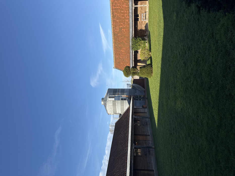 The image displays an outdoor scene within East Suffolk, United Kingdom, centered on a rectangular green lawn partially covered by a distinct shadow in the foreground. To the left, a linear, single-story building features a dark brown tiled roof over a lighter corrugated metal lean-to structure, presenting a facade of horizontal wooden planks with multiple visible wooden doors and windows. To the right, another single-story building with a prominent reddish-brown tiled roof, also constructed with wooden walls, includes a window and a small wooden bench positioned underneath a section of green foliage. In the background, a tall, cylindrical structure resembling a modified grain silo stands prominently, constructed from corrugated galvanized metal with a conical roof and containing multiple rectangular window openings and an external metal staircase. Two distinct topiary shrubs, one conical and one rounded, are situated on the lawn near the right building. The overhead sky is clear blue with minimal wispy white clouds. No human subjects, animals, or active interactions are present in the scene.
