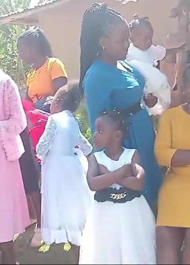 group of people dressed up in different colors and styles of clothing. Some of the people appear to be children. The people are standing outside in a grassy area, possibly near a building. Some are interacting with each other, talking, and taking photos. There is a white car parked in the background. Some people are dressed in similar colored dresses, maybe for a special occasion or event. There are trees and other foliage in the background. The overall atmosphere appears to be festive.