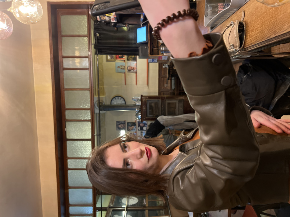 A woman with red lipstick and a brown leather jacket is seated at a wooden bar. She wears a brown beaded bracelet. Behind her is a tall window with multiple panes, a wall, and glimpses of the interior space. In the background, there are clocks, various pictures, and furniture, suggesting a café or bar setting. The perspective is slightly tilted, with the woman positioned in the foreground, commanding the viewer's attention.