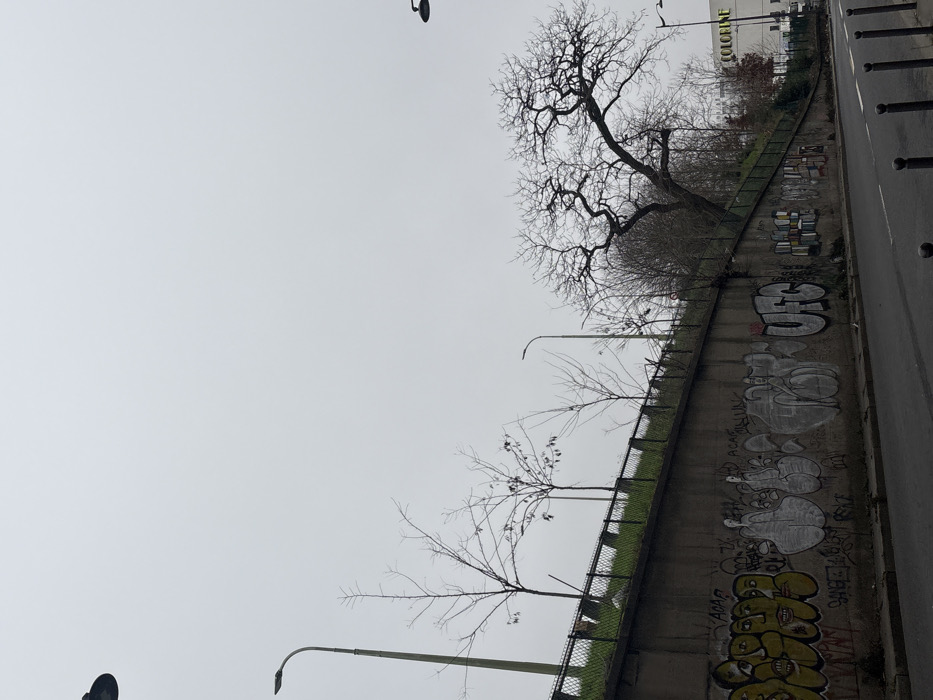 This image depicts an urban street scene in Gentilly, France, under an overcast sky. A two-lane asphalt road occupies the foreground, running parallel to a graffiti-covered concrete retaining wall that rises along the right side of the frame. The wall is extensively spray-painted with various tags, including yellow cartoon faces, white and grey bubble letters, the acronym "UFC," and text such as "ACAB." Above the wall, a grassy embankment is secured by a dark metal fence. Several bare deciduous trees, indicative of late autumn or winter, are visible along the embankment, interspersed with streetlights featuring curved arms. On the far right, a large, mature deciduous tree with a dense, gnarled canopy extends over the wall. In the distant background on the right, a multi-story building features a prominent "COLORINE" sign in white letters on a yellow facade. No individuals or active subjects are present in the scene.