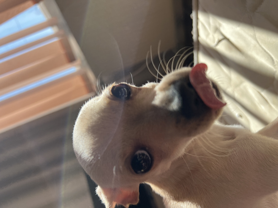 A small, light-fawn colored dog is depicted indoors in Gurkovo, Bulgaria. The dog's head is angled, presenting large, dark, reflective eyes and a dark nose, which is being actively licked by an extended, pink tongue. Whiskers are visible around the snout. Strong, direct sunlight illuminates the scene from the upper left, creating a prominent lens flare across the dog's head and casting distinct shadows. In the background, a window with light-colored vertical blinds is visible, showing a bright blue sky between the slats. The lower right portion of the image reveals a textured, light-colored surface, possibly upholstery or bedding, also highlighted by the sunlight. There are no other individuals or active interactions visible within the frame.