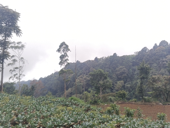 The image displays a rural landscape in Khna, Cambodia, characterized by agricultural fields and a forested mountainous backdrop under an overcast sky. In the foreground, a cultivated area is visible, densely planted with leafy green crops, likely a type of vegetable such as cabbage. Sections of reddish-brown, tilled soil are present, indicating recent preparation for planting. The midground features several tall, slender trees with varying foliage densities. These trees lead to a prominent, densely forested hill or mountain range occupying the background, covered by a uniform dark green canopy. The sky is uniformly bright white and light gray, indicative of an overcast day. No individuals, animals, or specific actions are depicted within the scene.