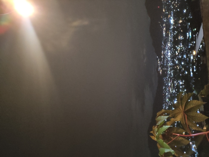 The image presents an elevated, nocturnal view of a sprawling cityscape identified as Kassel, Germany. The upper half of the frame is dominated by a dark, overcast sky. A prominent, intense artificial light source in the upper right quadrant emits a bright lens flare, characterized by a visible halo and colored chromatic aberrations, projecting a beam of light across the sky. In the lower-left foreground, a portion of a plant with large, palmate leaves, exhibiting colors ranging from green to reddish-brown, and a reddish stem, is visible and appears sharply in focus. The midground and distant background consist of the urban landscape, densely illuminated by countless scattered white and yellow artificial lights that outline structures and infrastructure. This illuminated city expanse is framed by dark, silhouetted hills or mountains on the horizon. No human figures or specific activities are discernible within the scene.