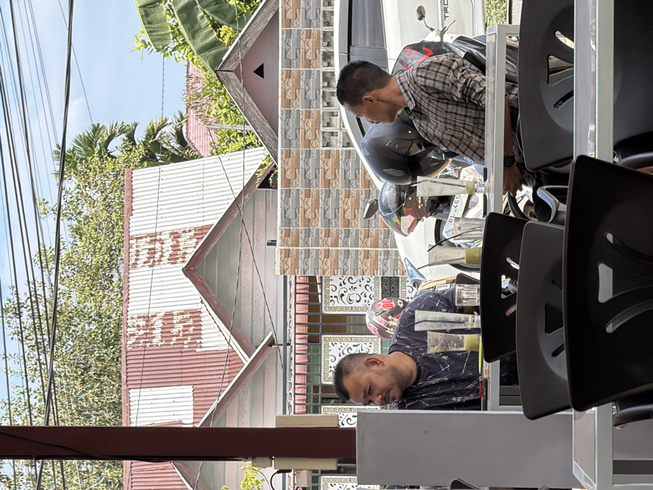 Two men are seen near motorcycles. One wears a plaid shirt and looks at a motorcycle. The other, in a dark patterned shirt, seems to be sitting at a table. The scene is outdoors, with buildings and foliage visible in the background. Power lines are strung across the upper left. Chairs with patterned backs are in the foreground.
