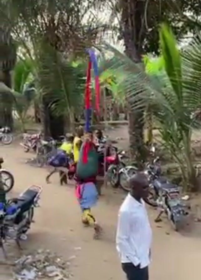 man dressed in an elaborate costume with a tall, curved, colorful headdress, dancing in a sandy area surrounded by other people. The man wears a green and red garment over a light-colored skirt, with yellow and black striped leggings. He moves with purpose and energy. Several men are standing nearby, observing him; one man is wearing a striped shirt, while others have on various casual attire. The environment includes palm trees, motorcycles parked along the sides, and some scattered debris on the ground. It appears to be an outdoor gathering or cultural event.