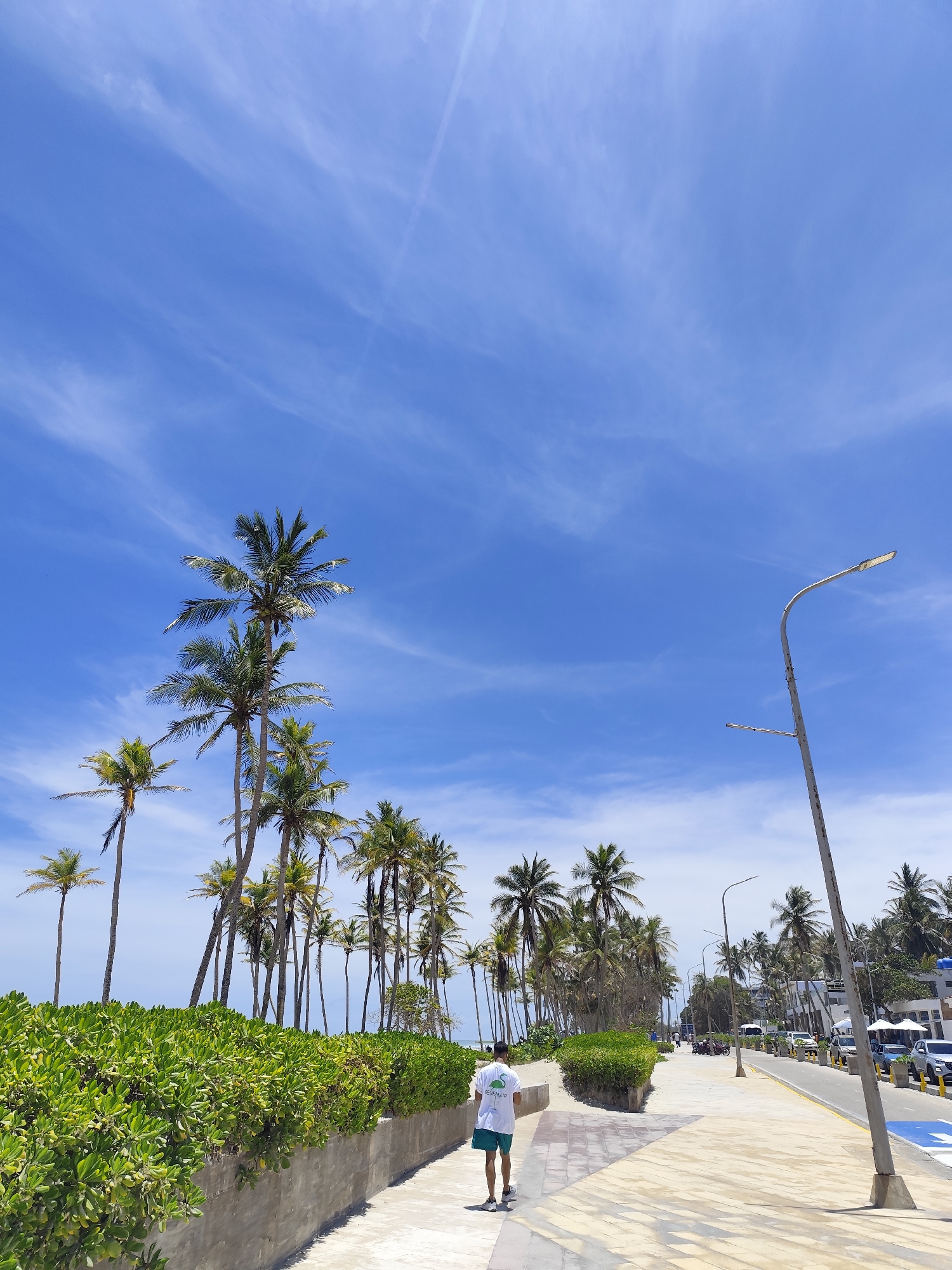 The image depicts a bright day at Playa El Agua, Venezuela. Wispy clouds decorate the clear blue sky. A row of tall palm trees lines the left side of a wide, patterned sidewalk. A man in a white t-shirt and green shorts is walking away from the camera on the sidewalk. A low, green hedge separates the sidewalk from the beach area. On the right, a paved road runs parallel to the sidewalk, with streetlights, parked cars, and buildings visible in the background. Several people are visible further down the sidewalk.