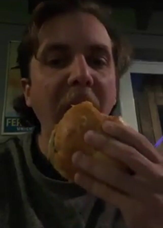 A man with a mustache is eating a hamburger. He is wearing a gray sweater. He looks directly at the camera as he takes a bite of the hamburger. Behind him is a dark wall with a poster. There is music playing in the background.