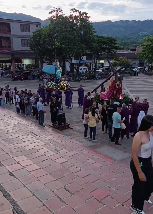 religious procession taking place on a brick-paved plaza. A group of people in purple robes carry a figure of Jesus on a cross and another bearing an effigy of the Virgin Mary, both adorned with flowers and lights. Behind them, a line of onlookers observes the procession. A speaker on a stand amplifies the proceedings. Two young women walk in the foreground, while vehicles and buildings are visible in the background, set against a backdrop of mountains under a cloudy sky.