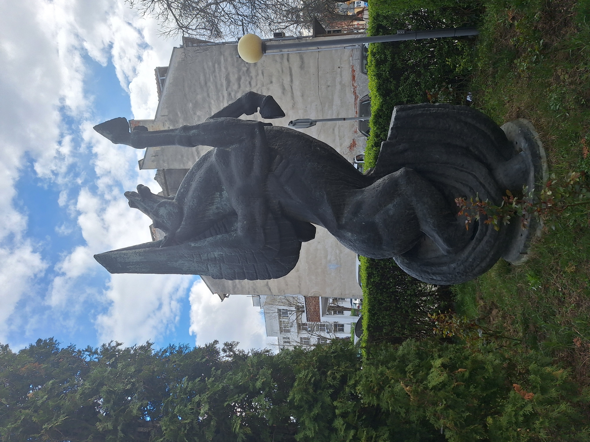 A bronze sculpture of a winged horse, possibly Pegasus, is displayed outdoors in Gabrovo, Bulgaria