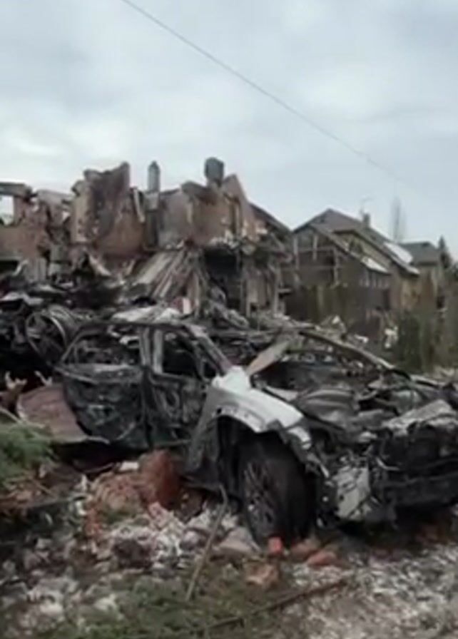 aftermath of a destructive event, likely caused by an explosion or bombardment. In the foreground, there is a heavily damaged silver vehicle, with its frame exposed and interior gutted by fire. Debris surrounds the car, including bricks and small tree branches. Behind the car, a building is almost completely destroyed, with only parts of the brick structure remaining. Adjacent to the destroyed building are other houses, some of which appear to be relatively intact. The sky is overcast, and patches of snow are visible on the ground. The scene suggests a residential area that has suffered significant damage, possibly during a military conflict or natural disaster.