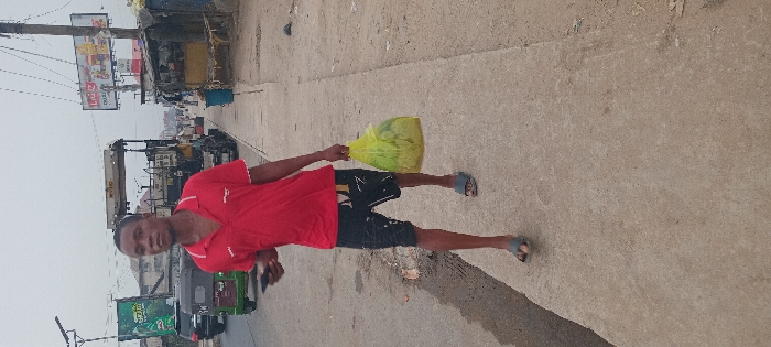 This image depicts a street scene in Aba, Abia, Nigeria, under an overcast sky. In the foreground, a male subject of African descent is walking on a concrete sidewalk, moving forward. He is dressed in a red short-sleeved polo shirt with white trim, black patterned shorts, and grey slide sandals. His left hand holds a black smartphone, while his right hand carries a translucent yellow plastic bag filled with green leafy vegetables. His gaze is directed slightly to the left of the camera. To the left of the sidewalk, a paved road is visible. A green auto-rickshaw (Keke Napep) and a dark SUV are present on the road. Further down the street, a large yellow and white construction vehicle, identified as a road paver, is positioned. Multiple utility poles with overhead wires line the street. A green-branded billboard is visible on the far left. On the right side of the street, beyond the sidewalk, are several makeshift structures constructed with corrugated metal, resembling small shops or market stalls. A blue plastic waste bin is situated near these structures. A prominent billboard displaying "LUZ" and images of food items is mounted above these stalls. The ground immediately adjacent to the right edge of the concrete sidewalk is unpaved, consisting of dirt and scattered debris.