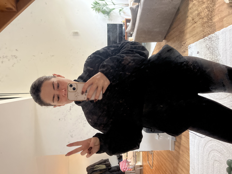 A female subject is depicted in a full-length mirror selfie, positioned in a residential interior in Roubaix, France. She faces forward, holding a light-colored smartphone with a patterned case in her right hand, which partially obscures the lower portion of her face. Her left hand is raised, forming a peace sign with extended index and middle fingers. Both hands display nails painted with a dark base and a light, speckled design. Her hair is dark and pulled back. She wears a dark-colored, long-sleeved mock-neck or turtleneck top and matching dark leggings or close-fitting trousers. The fabric of her attire appears textured. The environment reflected in the mirror behind the subject features an open-plan living area. To the subject's left, a dark garment hangs on a hook, and a dining area is visible with a transparent-topped table and two transparent chairs with chrome frames. A red and white striped fabric is draped over one chair. To the subject's right, a light-colored, possibly corduroy, sofa with two matching pillows is present. Behind the sofa, a dark-screened television sits on a media console. A tall, green potted plant with large leaves stands to the right of the television. The walls are light-colored, possibly off-white or light grey, and exhibit irregular dark markings or texture. The floor is covered with light-toned wooden planks. A white or light-grey area rug with a subtle raised pattern is situated in the foreground, with a dark cable visible on it towards the lower left. Green, spherical decorative items are partially visible and out of focus in the bottom left corner. A wooden staircase element is visible in the upper right.