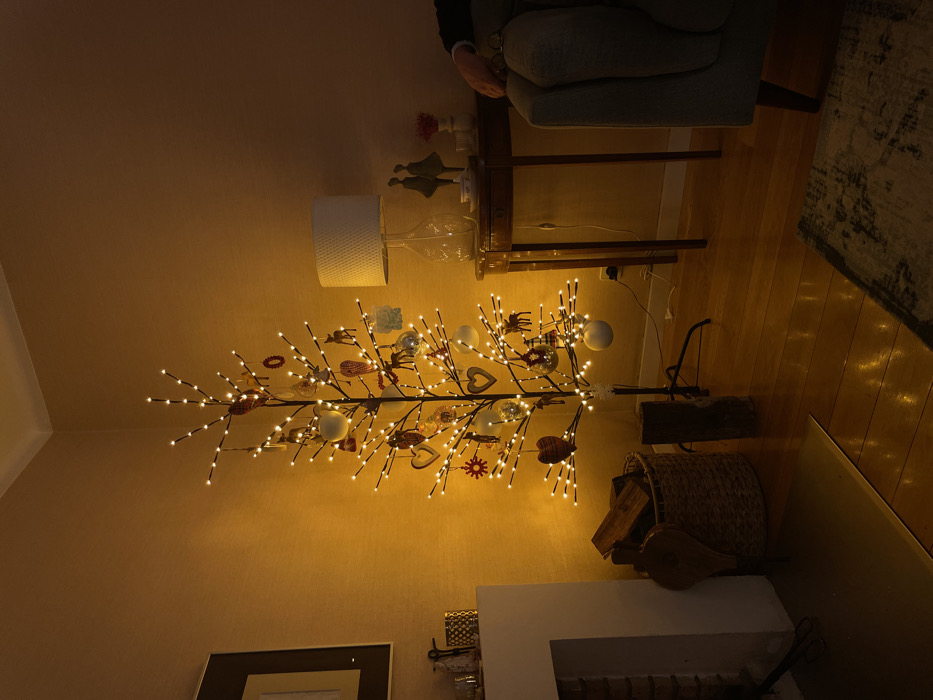 A sparsely decorated Christmas tree with warm-toned lights stands next to a fireplace