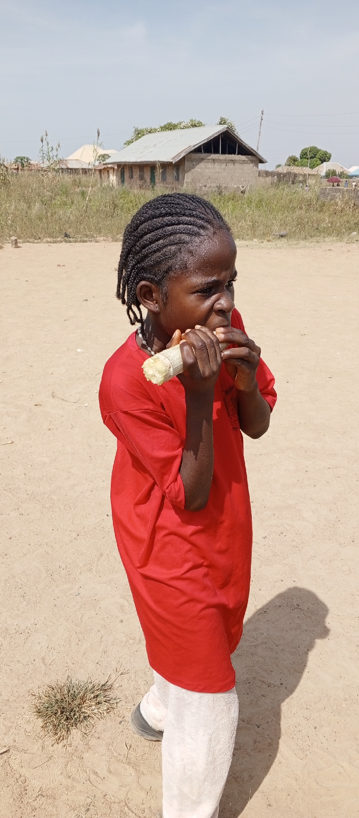 The image depicts a young girl in an open, sandy area within Kakau, Nigeria. The girl, with dark skin and hair braided in cornrows, is wearing a red short-sleeved t-shirt, light-colored trousers, and dark footwear. She is positioned facing right, holding a thick, cylindrical piece of light-colored plant material, consistent with sugarcane, to her mouth and actively consuming it. Her hands are visible assisting with the action. The ground consists of dry, light brown sand with scattered small clumps of green vegetation. In the background, beyond a line of tall, dry grasses and weeds, stand multiple buildings under a hazy, light blue sky. The most prominent structure is built of light-colored cinder blocks with a dark-colored corrugated metal roof featuring a steep pitch and an open gable end. Green panels, possibly shutters or doors, are visible on its side. Further back, additional buildings with lighter roofs are discernible. A utility pole with wires is visible to the right of the main building. Strong sunlight casts distinct shadows on the sandy surface.