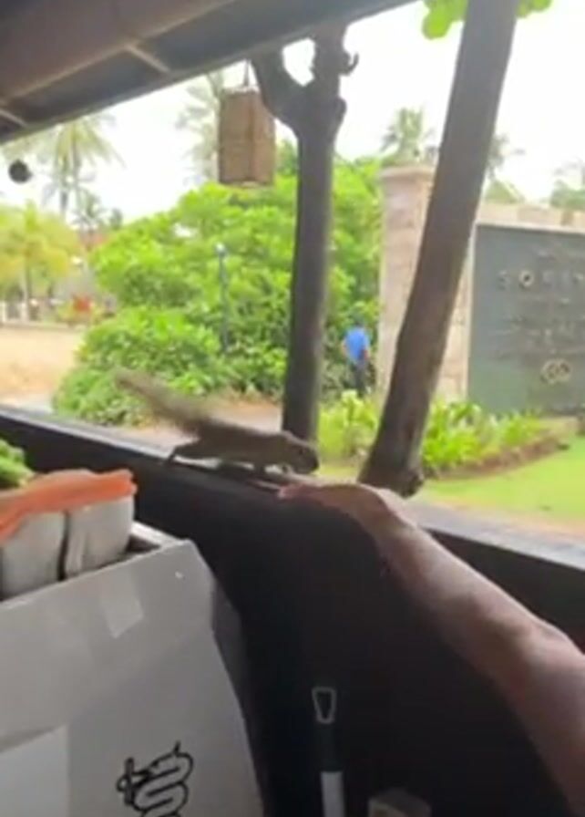 squirrel on a wooden ledge near a hand. The person’s hand holds out a small morsel of food for the squirrel. The squirrel carefully approaches the hand and takes the food. The squirrel then runs off the ledge. In the background are lush green trees and the entrance sign to a hotel called "Sofitel." Behind the ledge is a white Bezzera espresso machine with a cleaning cloth resting on top of it, along with some white coffee mugs.