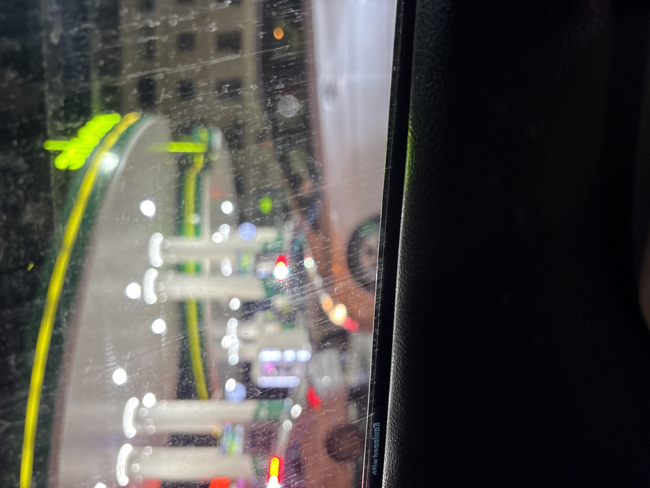 The image depicts a nighttime scene at a BP gas station located at Vazha-Pshavela Avenue, 71, Tbilisi, Georgia. The perspective is from inside a vehicle, looking out through a dirty or wet passenger window, evidenced by visible streaks and reflections. The gas station canopy, featuring characteristic green and yellow stripes and a faint illuminated "BP" logo on the right side, is brightly lit by numerous white overhead lights and lights on the supporting pillars. Below the canopy, multiple vehicles are present, indicated by visible red taillights and blurred outlines. A light brown or orange sedan is positioned in the mid-ground, partially obscured, with a lighter-colored vehicle to its right. Fuel pumps are visible underneath the canopy. In the background, to the right of the gas station structure, a multi-story building with illuminated windows is discernible. The foreground shows the dark top portion of a vehicle's interior door panel and window sill, with faint, mirrored text "dtiw beagluq3" visible as a reflection on the lower part of the window glass. No individuals are clearly identifiable.