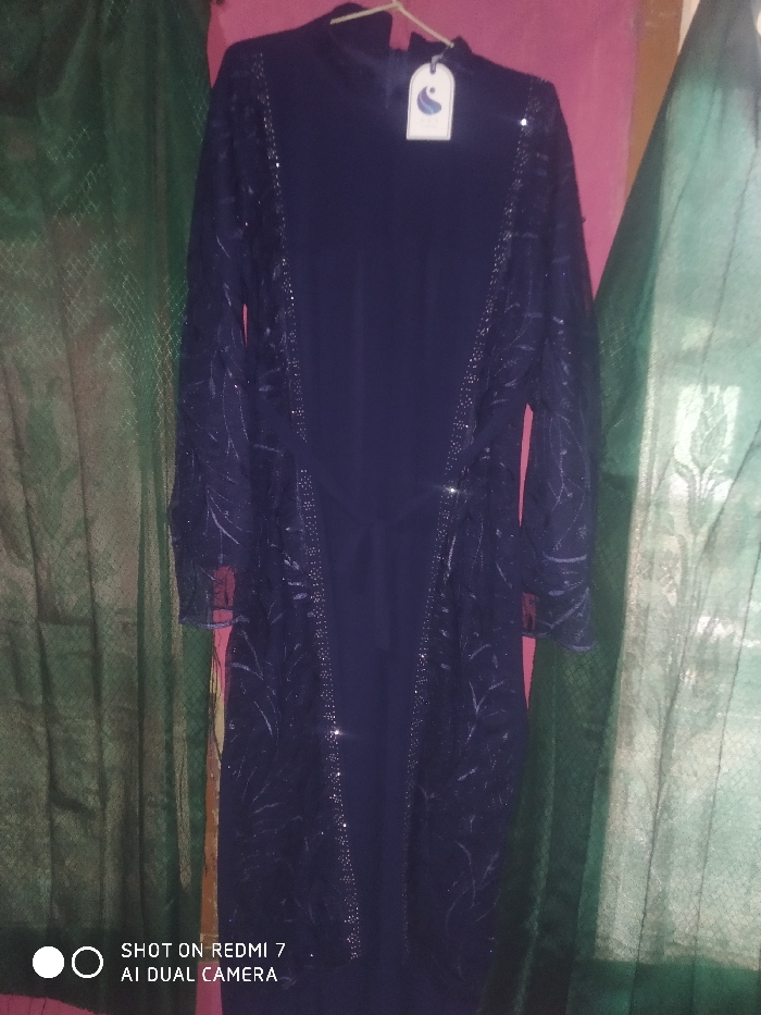 A navy blue dress hangs in front of a pink wall flanked by shimmering green curtains. The dress features a high collar, a solid central panel, and a belt. The sleeves and surrounding panels are embellished with a sparkly, leaf-like pattern and bordered with small, reflective beads. A tag with a logo is attached to the collar. The bottom of the image includes text indicating the picture was taken with a Redmi 7 AI Dual Camera.