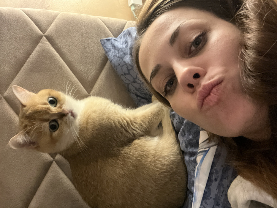- "A light-skinned woman takes a selfie with her ginger-colored cat while lying on a bed" by FM-aQUtB3, licensed under CC BY 4.0