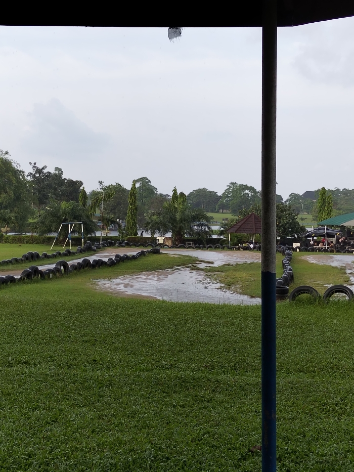 This image depicts an outdoor recreational area in Rumuomasi, Nigeria, under an overcast sky. The scene is partially framed by a dark overhead structure and a grey vertical pole with a blue-painted base on the right. The foreground features a expanse of green grass. A dirt track, heavily puddled from recent rain, curves through the midground. The track's edges are delineated by numerous black tires laid horizontally. To the left, a white-framed swing set is positioned near the track. In the midground, a small, open-sided structure with a reddish-brown pyramidal roof stands adjacent to the track, surrounded by palm trees and other dense foliage. Further right, another structure with a green roof is visible. In the background, a body of water, appearing to be a lake or pond, stretches across the scene, bordered by a green, tree-covered embankment. Indistinct human figures are visible near the green-roofed structure and along the water's edge, some appearing to be seated. Small recreational vehicles, possibly go-karts, are parked near the green-roofed structure.
