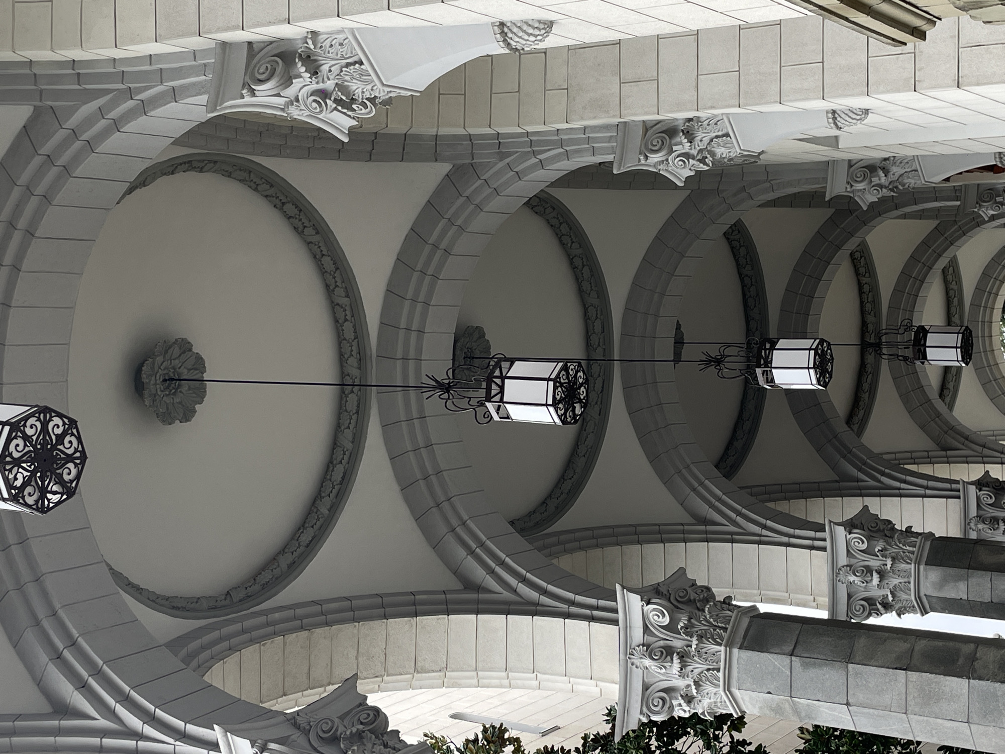 n interior architectural detail, featuring a series of arches with ornate detailing. Each archway is bordered by a textured gray stone or concrete, and the ceiling within each arch is a smooth, lighter gray or off-white. Decorative medallions are centered within each arched ceiling. Linear light fixtures are suspended from the ceiling, running along the length of the arches. The architecture appears to be classical or neoclassical in style, with Corinthian-style columns and intricate carvings visible. The environment appears to be a well-maintained interior space, possibly a hallway or arcade within a larger building. The location in the city of Sochi, Russia is not evident from this image.