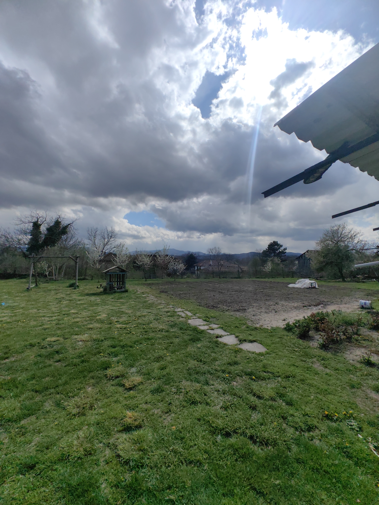 The image depicts an outdoor scene in Hirevo, Bulgaria. The foreground features a green lawn with scattered dandelions and stone pavers leading towards a tilled garden plot. To the left, there's a wooden swing set and a small wooden structure resembling a well or shed. In the background, houses and blossoming trees are visible beneath a cloudy sky with patches of blue. The sun shines through the clouds, casting a ray of light. An overhanging roof structure is visible in the upper right corner. In the garden plot, there's a white covering or tarp.