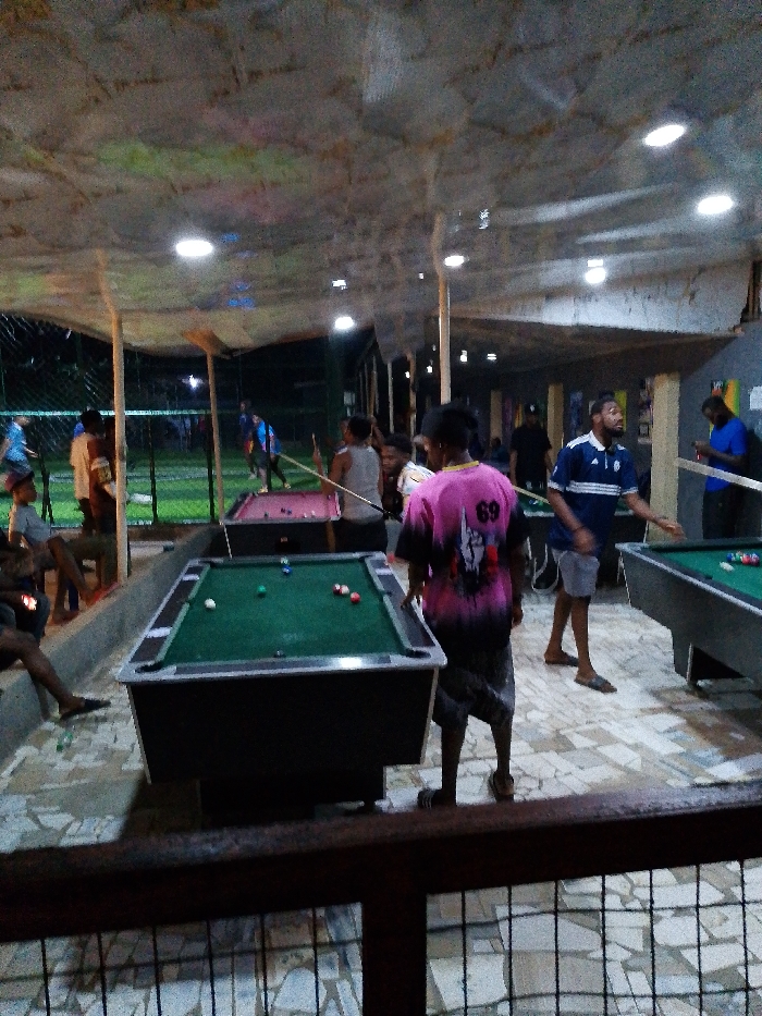 Inside an open-air billiard hall, several individuals are playing or watching pool