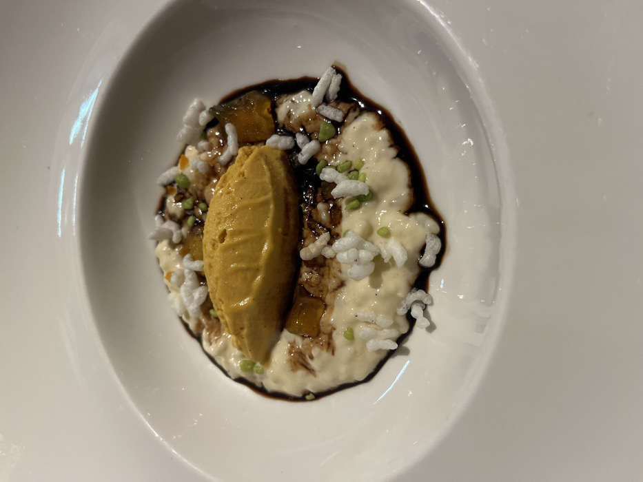 A close-up, overhead shot displays a single serving of a dessert presented in a white, shallow ceramic bowl with a wide rim. The dessert features a creamy, off-white base, partially covered by a dark brown viscous sauce or glaze, which pools around the edges of the creamy component. A single scoop of vibrant orange-yellow sorbet or ice cream, possessing a smooth texture, is centrally positioned atop the creamy base. The dish is garnished with scattered white, irregularly shaped crispy pieces (resembling puffed rice), small translucent amber-colored gel cubes, and minute green granules. The lighting appears artificial, highlighting the dessert and producing subtle reflections on the bowl's glossy surface. No individuals, actions, or specific environmental identifiers are visible beyond the plating, suggesting an indoor dining setting. The precise location within the city of Sofia, Bulgaria, cannot be determined from the image.