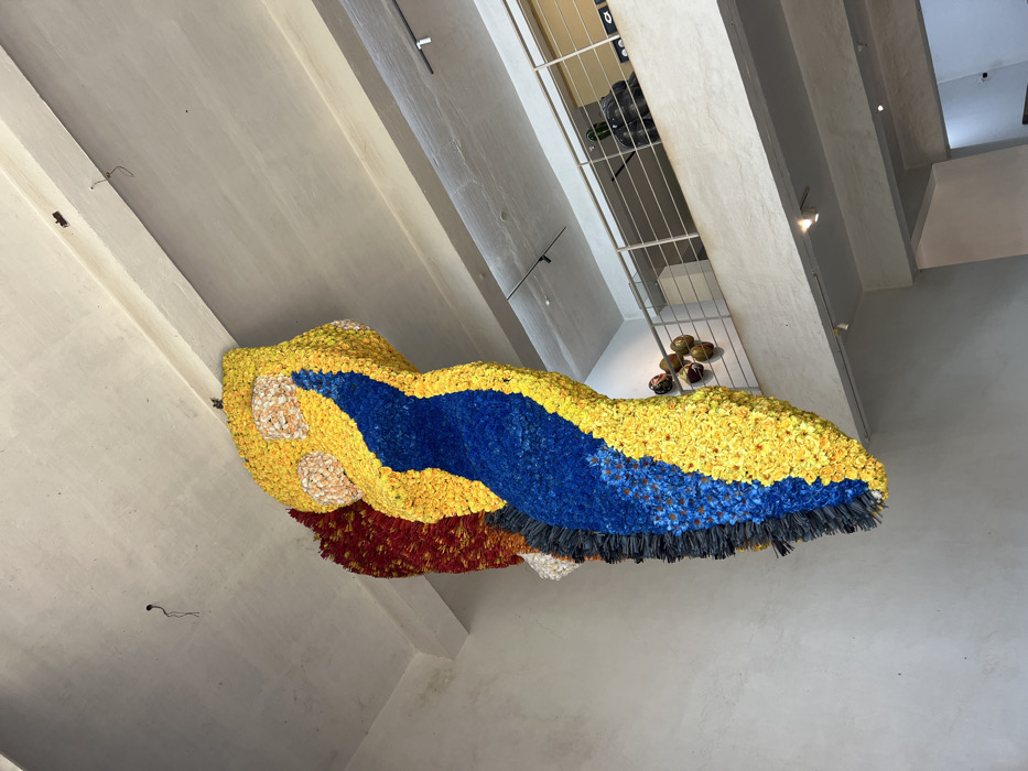 large floral sculpture hanging from the ceiling of a modern, light-filled space. The sculpture is composed of yellow, blue, and red flowers and appears to depict a human form. It hangs over a balcony with a metal railing, on which there are other smaller sculptures. The space has concrete floors and white walls. The location is a building in the city of Marra, India.