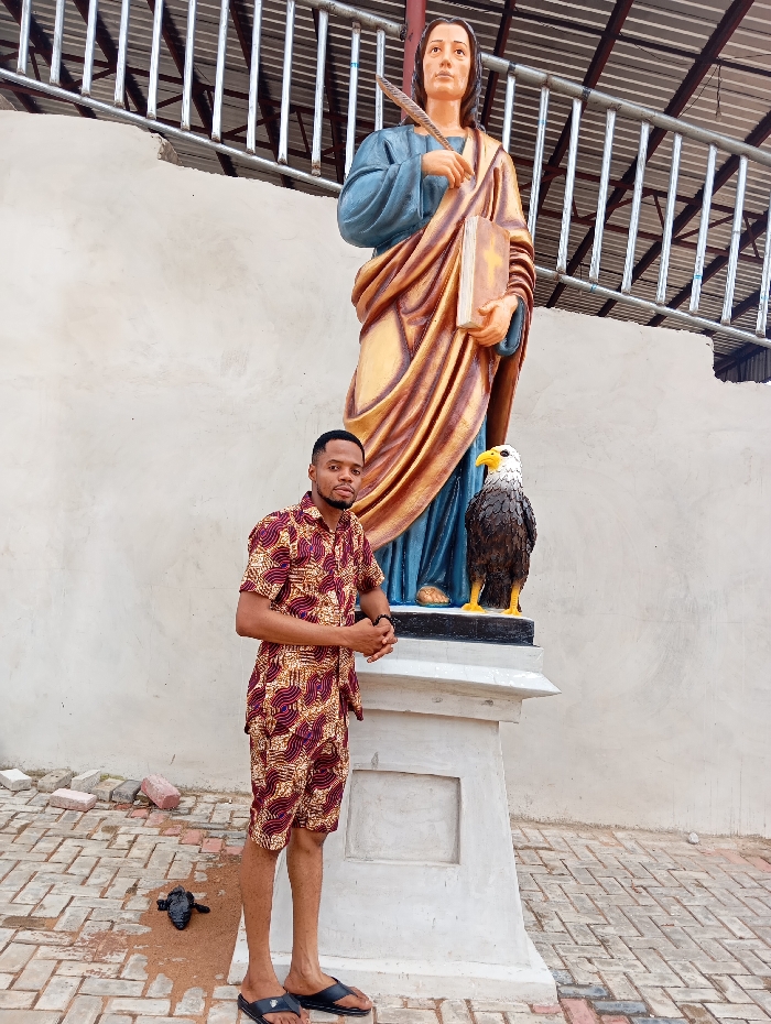 The image displays an adult male subject posing outdoors next to a religious statue ensemble, located on the grounds of St. John the Evangelist Catholic Church in Onitsha, Nigeria. The central feature is a large, multi-colored statue of Saint John the Evangelist, standing on a multi-tiered white pedestal. The saint is depicted wearing a blue tunic and a flowing golden-brown toga. He holds a quill in his right hand and an open book, marked with a cross, in his left hand. An additional statue of an eagle, with a dark body and white head/tail, is positioned at the base of the pedestal next to the saint's feet. To the left of the pedestal stands an adult male, estimated to be in his late 20s or early 30s. He is dressed in a short-sleeved collared shirt and matching shorts, both featuring a maroon, brown, and cream geometric pattern. He wears black flip-flops. His hands are clasped in front of him, and he faces slightly towards the camera. The ground surface is paved with reddish-brown interlocking bricks. A small, dark, irregular object lies on the paving near the man's left foot. The background consists of a plain, light-colored wall, above which a structure of horizontal metal bars is visible. The scene is uniformly lit, indicating a daytime setting.