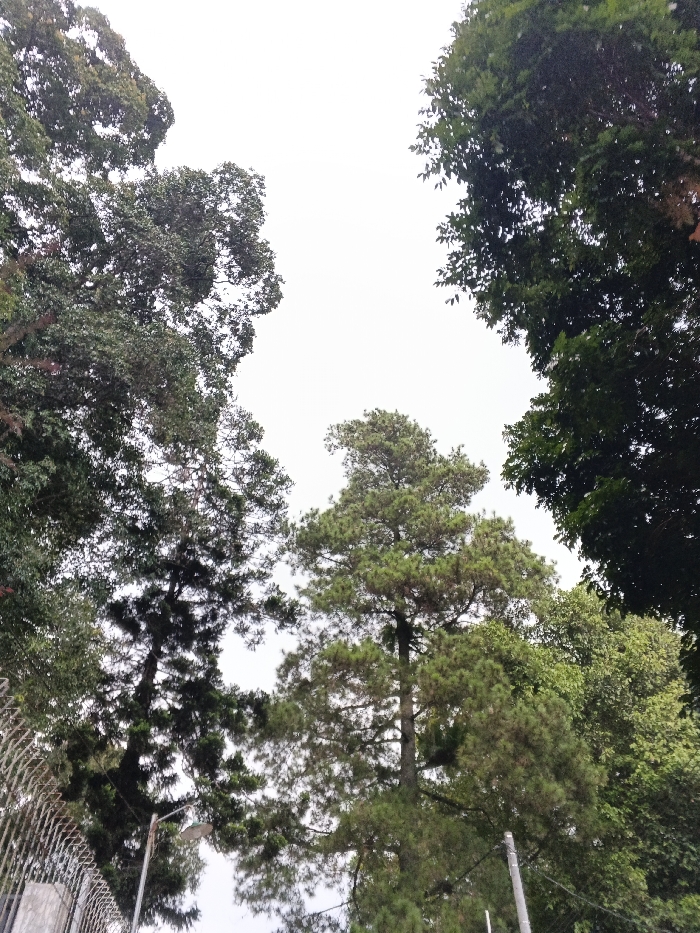 The image displays an upward-angled view into a dense arboreal canopy against an overcast, uniformly light-grey sky, located in Xiulin, Taiwan. The scene is dominated by tall trees, featuring prominent coniferous trees with needle-like foliage in the central and right portions of the frame. Broad-leaved trees with dark green foliage are visible along the left and right perimeters. In the lower-left quadrant, a light-colored metal fence or railing extends diagonally from the corner, partially obscuring a dark-colored streetlamp or utility pole positioned vertically. A second slender, light-colored pole is partially visible vertically in the lower-right quadrant. No human or animal subjects are depicted, and no actions or interactions are observed. Ambient light is diffuse, consistent with an overcast sky.