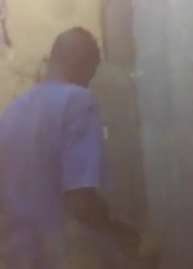 A man is inside a partially demolished room, wearing a blue t-shirt and light colored shorts. The walls are a light, dirty color and have areas of missing plaster. He is crouching and appears to be using his hands to clear debris from a bucket on the floor. The video quality is poor and the room appears dusty.