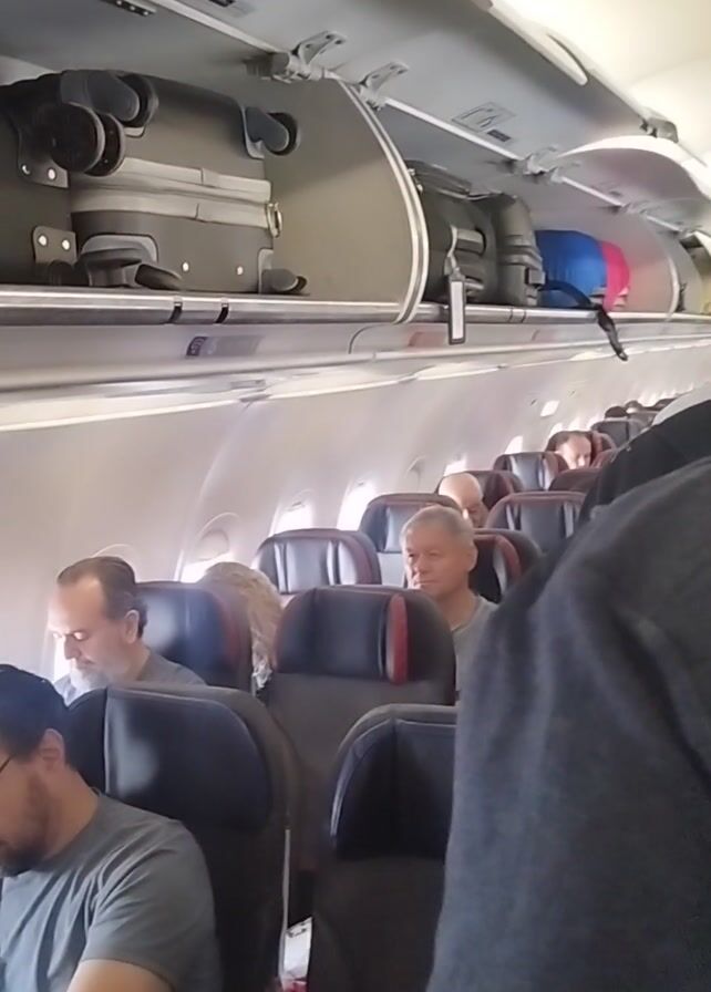 n airplane aisle with passengers seated. Overhead compartments are visible along the top of the frame. Passengers of various ages and with different hairstyles are visible in the seats. A person wearing a black quilted jacket and green baseball cap is closer to the camera, facing the back of the plane.