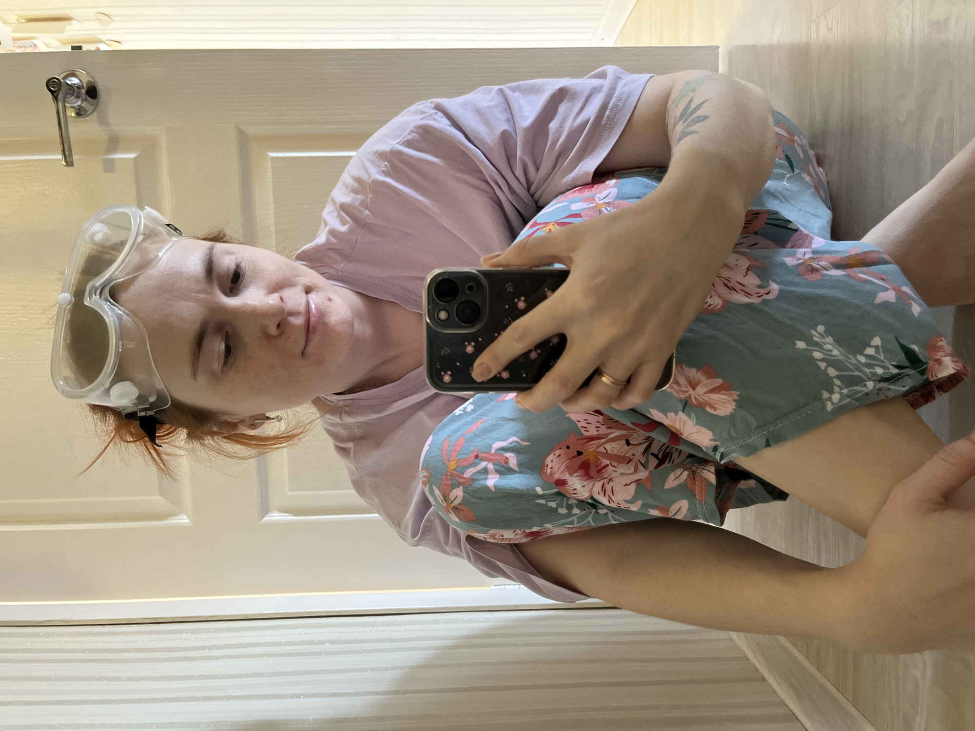 A red-haired woman with goggles on her head is taking a selfie with her phone. She is wearing a lilac-colored shirt and floral-patterned pants. She is sitting on the floor in a room with a white door and white and gray striped walls. The location is possibly a bathroom, but it is difficult to say for sure. The location in the city of Chaikovsky, Russia is not determinable from the given information.