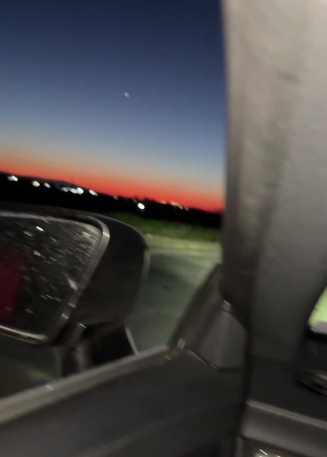 view from inside a car driving at dusk. The sky transitions from dark blue to orange near the horizon, with a few stars visible. Streetlights and power lines are visible in the distance. The car's dashboard, steering wheel, and side mirror are visible, with the yellow turn signal indicator illuminated on the side mirror. The car is moving, as evidenced by the changing scenery outside.