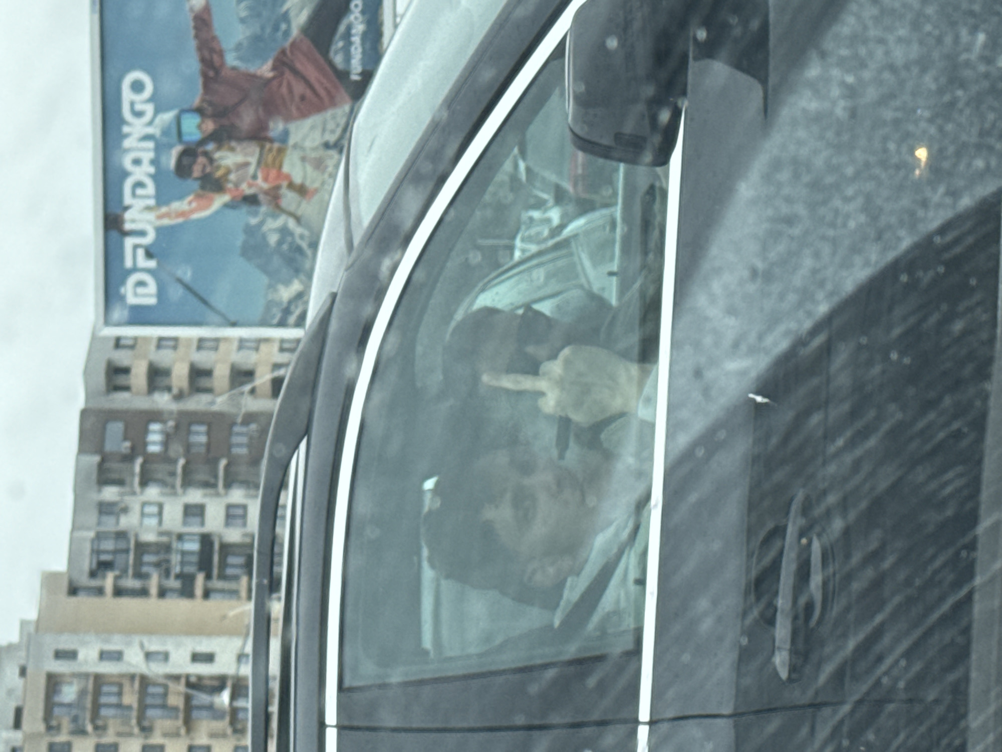 This image depicts an urban street scene in Bucharest, Romania. In the midground, a dark-colored vehicle is observed from its driver's side. Inside the vehicle, the driver, an individual with short, dark hair and wearing a light-colored garment, extends their right middle finger upwards, directed towards the observer. A second individual is partially visible in the front passenger seat, wearing sunglasses and looking forward. The vehicle's windows are wet or smudged. In the background, a large billboard displays the text "ID FUNDANGO" and features two stylized figures engaged in winter sports against a snowy mountainous backdrop. To the left of the billboard, multiple multi-story buildings with balconies are visible, featuring facades in shades of beige and grey. The sky above is overcast.