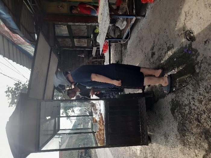 A man in a helmet examines food inside a glass display case. He wears a navy blue shirt and dark shorts, with blue sandals on his feet. Another man, in a black shirt, stands behind him. The display case is set on a dark metal frame. A concrete area surrounds the scene, with shops visible in the background. A red-shirted person is seen in the distance, further back in the scene.