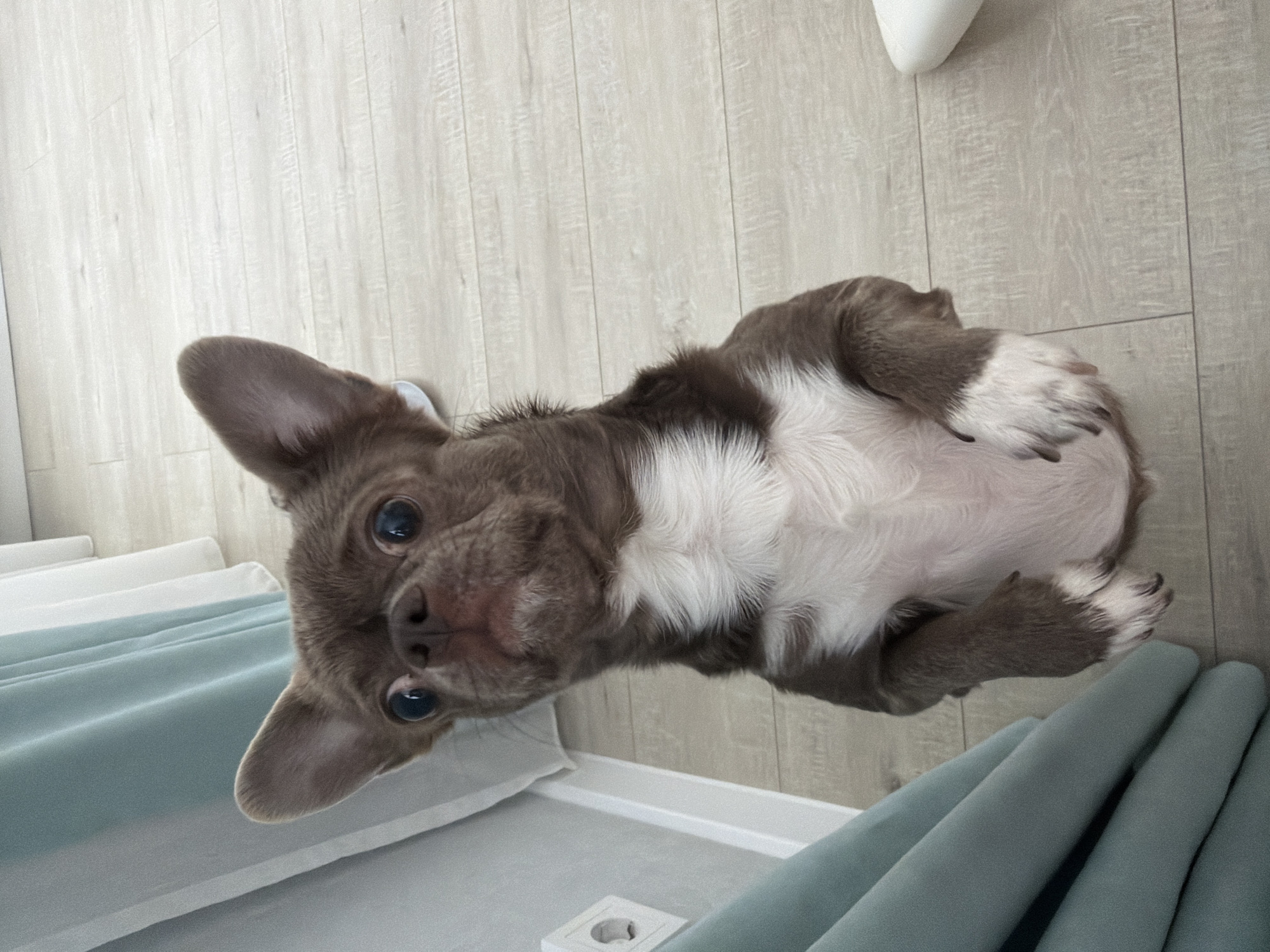 A small, short-haired canine, identified as a Chihuahua or similar small breed, stands upright on its hind legs, centered in the frame. The animal exhibits chocolate brown fur with distinct white markings on its chest, underbelly, and the distal portions of its front paws. Its large, erect ears are prominent, and its dark, round eyes are fixed directly towards the viewer. Its front paws are held close to its chest. The scene is an indoor environment with light-toned, possibly laminate or wood-look, flooring visible across the lower half of the image. Along the left side, light teal-colored fabric drapes are visible, adjacent to a light-colored wall. A white electrical outlet is mounted on this wall, positioned low and to the left of the canine. A partial white object is visible on the far right. The image was captured in a residence within the city of Votkinsk, Russia.