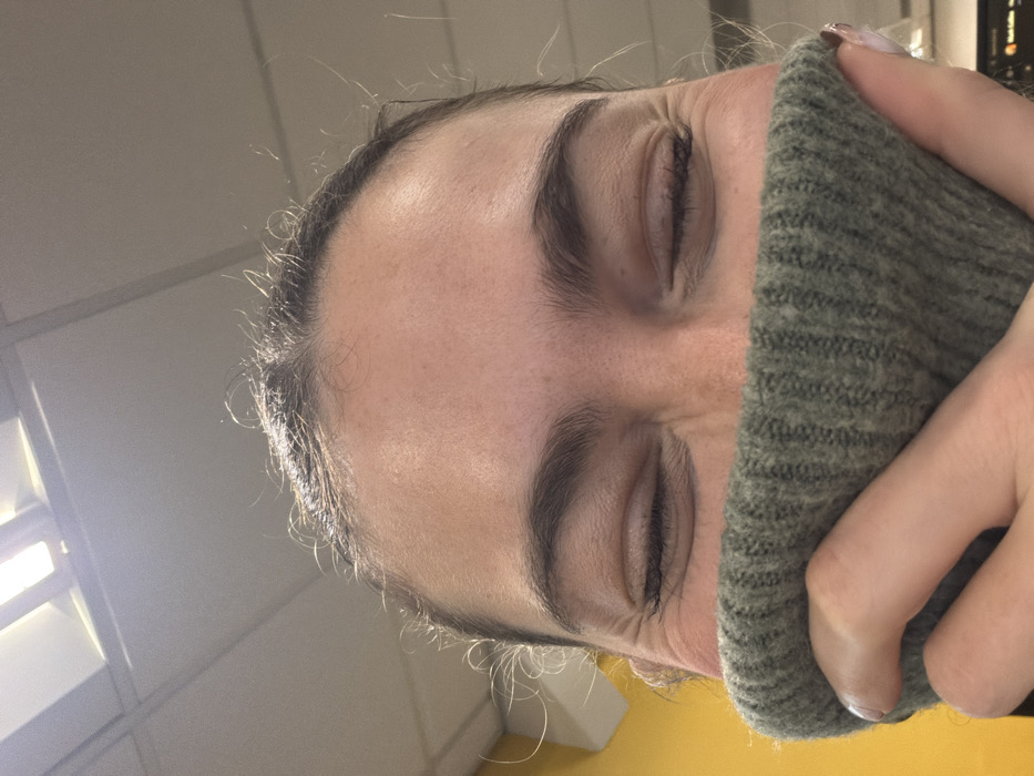 A close-up, low-angle image depicts the upper face of an individual, with their eyes closed and prominent periorbital wrinkles, indicative of a strong smile or laugh. Dark hair is pulled back, showing some flyaway strands. The lower portion of the face is obscured by a textured, olive-green knitted garment, held in place by a hand with light-colored manicured fingernails. The background reveals an indoor environment featuring a suspended grid ceiling with white tiles and rectangular fluorescent light fixtures. A section of a bright yellow wall is visible on the left, and a dark, rectangular object, possibly an electronic display screen, is partially visible on the far right. No specific identifying markers are visible within the image to pinpoint an exact location in Manchester, United Kingdom; however, the scene's generic architectural elements are consistent with public or commercial indoor spaces such as transport hubs, educational institutions, or retail environments within the city.