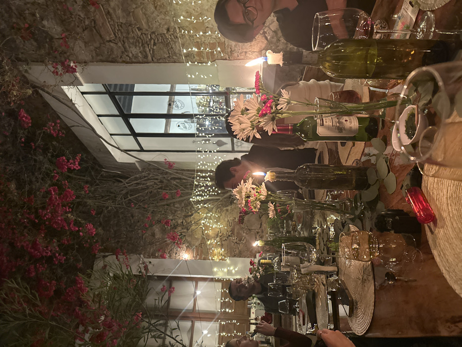 An outdoor dinner scene unfolds under soft string lights. A long wooden table, set with candles, floral arrangements, and wine bottles, hosts a group of people. Wine glasses are scattered across the table, suggesting a lively atmosphere. Beyond the table, a stone wall is adorned with climbing pink flowers, visible against the black frame-window. The low lighting casts a warm, intimate glow over the gathering, creating a cozy ambiance.