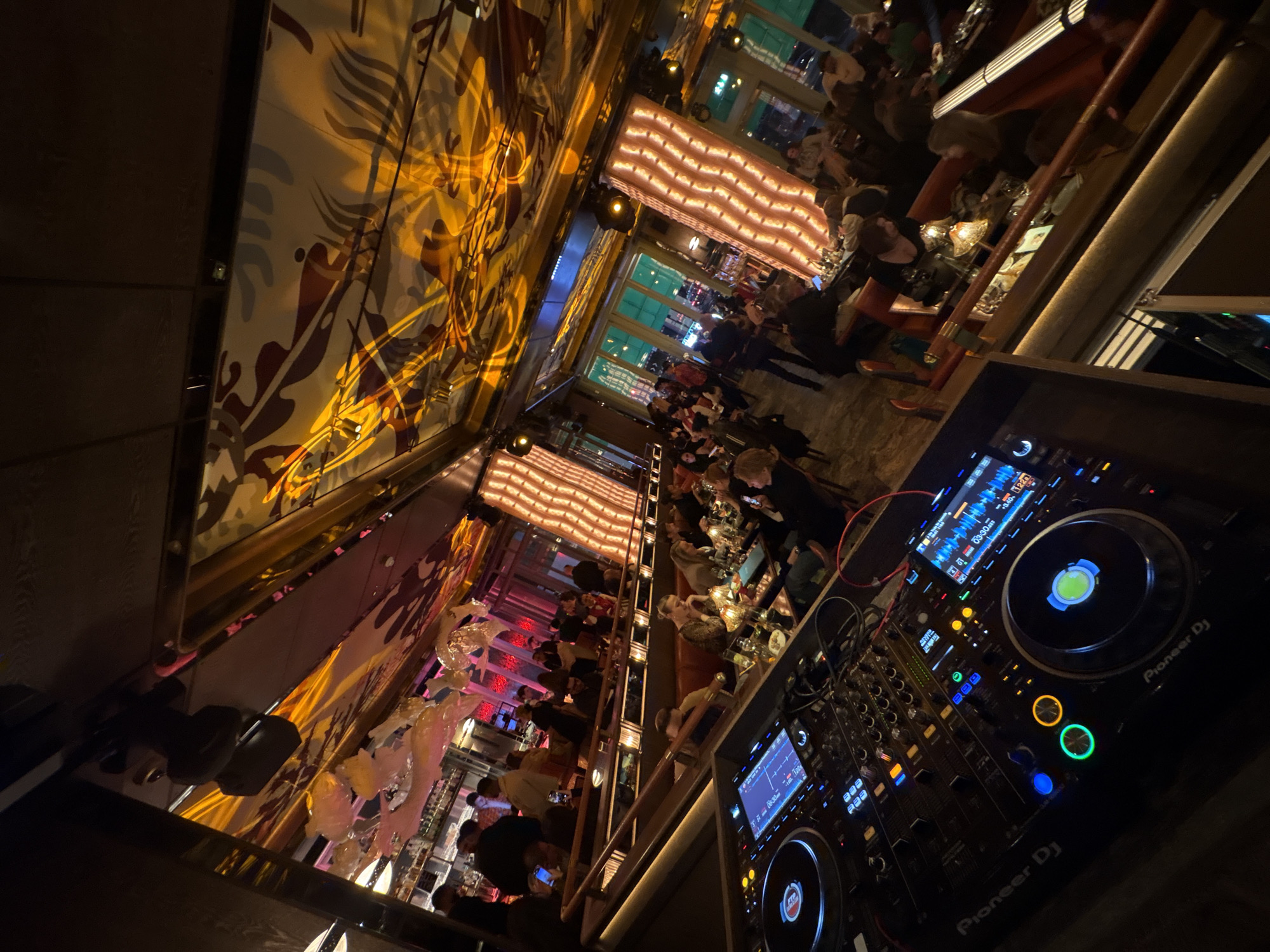 The image is taken from an elevated perspective, likely from a DJ booth, in a dimly lit, crowded restaurant or bar, potentially in London, United Kingdom. The room is long and narrow, with people seated at tables on either side. The ceilings are decorated in a contemporary, graphic style. The lighting is a mix of warm and cool tones. In the foreground is a DJ console, a Pioneer DJ unit. The image is slightly tilted. People are seated at tables, presumably dining and socializing. The architecture has ornate, modern elements. There are two floors to the restaurant, lit with horizontally-patterned light panels.