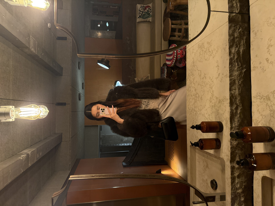 The image displays a full-length mirror reflection of a female individual engaged in taking a selfie with a light-colored smartphone. The subject has long, dark, straight hair and is attired in a dark brown, shaggy fur coat worn over a light-colored, possibly cream or pale grey, slip dress featuring lace detailing on the bust. A small black handbag is held in her left hand. The foreground consists of the mirror's base resting on a multi-tiered countertop made of light-colored, veined stone. On the upper counter, two amber-colored dispenser bottles and a chrome faucet are visible. Two additional identical amber bottles are present on a lower stone surface. The background, reflected in the mirror, reveals an interior space with an industrial-chic aesthetic. The ceiling is composed of exposed concrete beams and slabs, from which multiple clear, vintage-style filament light bulbs are suspended. The walls are a warm reddish-brown or rust-orange hue. To the left, a dark staircase with metal railings is partially visible. To the right, a low-slung, cream-colored sofa is present, accessorized with an abstractly patterned cushion. Several small, irregular wooden stools are grouped near the sofa, alongside a distinctive red and white textile object that resembles a stylized mask or folk art creature. Wall-mounted spotlights provide additional illumination. This specific design, combining raw concrete, industrial lighting, warm wood tones, and eclectic furnishings, is characteristic of the Mama Shelter hotel chain. The setting precisely aligns with design elements observed in the public areas and restrooms of **Mama Shelter Paris East, located in the 20th arrondissement of Paris, France.**